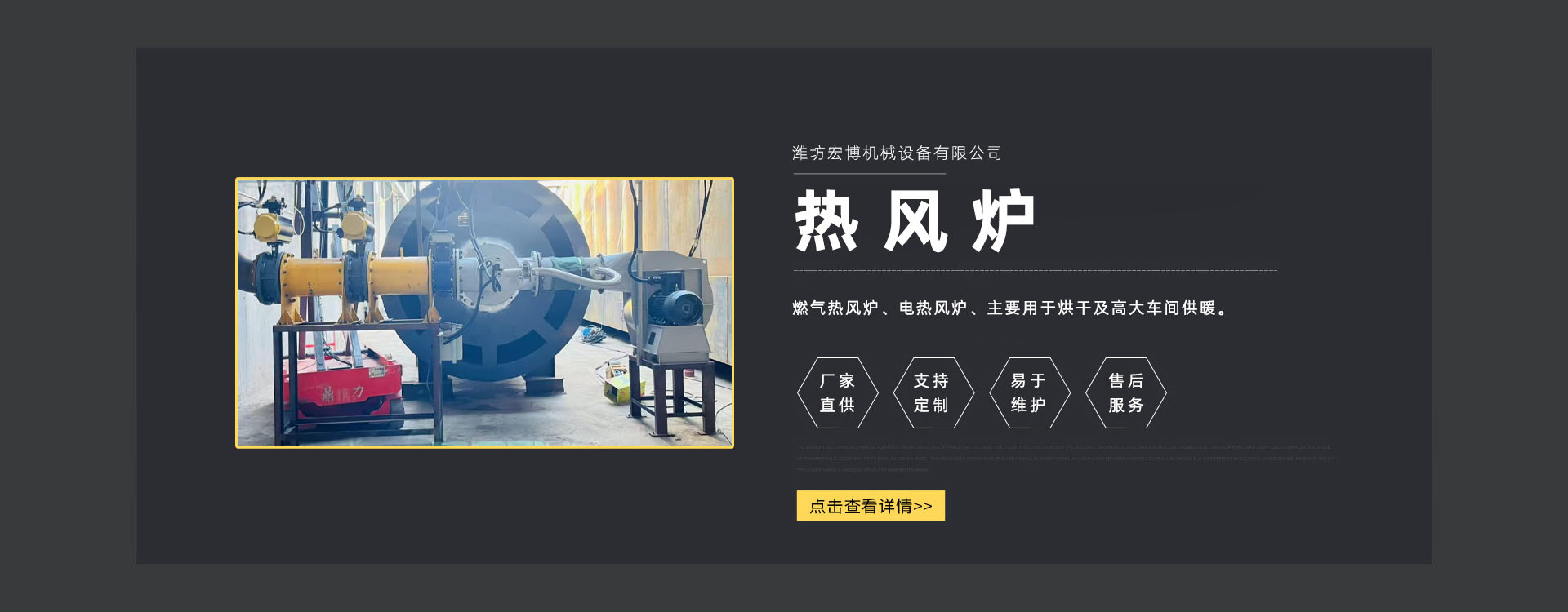 濰坊宏博機(jī)械設(shè)備有限公司是從事熱風(fēng)爐、烘干設(shè)備、供暖設(shè)備的研發(fā)(fā)、設(shè)計(jì)、制造和服務(wù)于一體的實(shí)體企業(yè)(yè)。長(zhǎng)期以來,企業(yè)(yè)以市場(chǎng)的發(fā)(fā)展和客戶的需求為導(dǎo)向,集多年的生產(chǎn)技術(shù)與經(jīng)驗(yàn)為一體,不斷開發(fā)(fā)和優(yōu)(yōu)良產(chǎn)品。